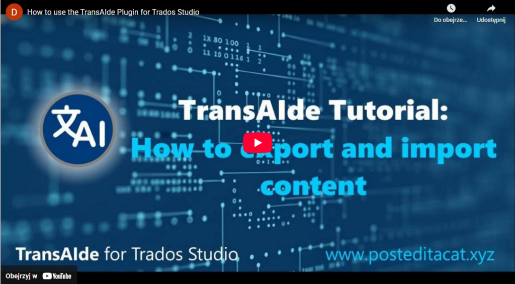 How to use TransAIde Plugin for Trados Studio? On YouTube, you can find three videos in which I demonstrate how the TransAIde plugin for Trados Studio works. 📢 How can you export content and glossary to translate it with AI and then import tralsation? In the video below I demonstrate how to use the TransAIde …