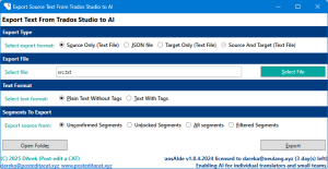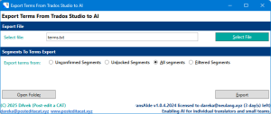 You have the option to export text with or without tags, and from all segments, or only from unconfirmed, unlocked, or currently filtered segments. You can also export terms from the termbase that appear in the document. TransAIde exports terms divided into required and forbidden terms.