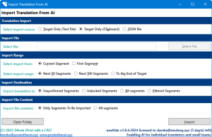 In addition to exporting the document to a text format, you can also export it to a JSON file. This file contains not only the source text but also the current translation, segment status, and other necessary information, as well as space for the AI model’s response and comments. You can then send this structured file to an AI model to perform a translation or other complex tasks, such as review, proofreading, translating fuzzy matches, correcting grammar, applying specific linguistic instructions, paraphrasing text, and many other actions. All these tasks can be performed with the full context of the document, ensuring consistent results.